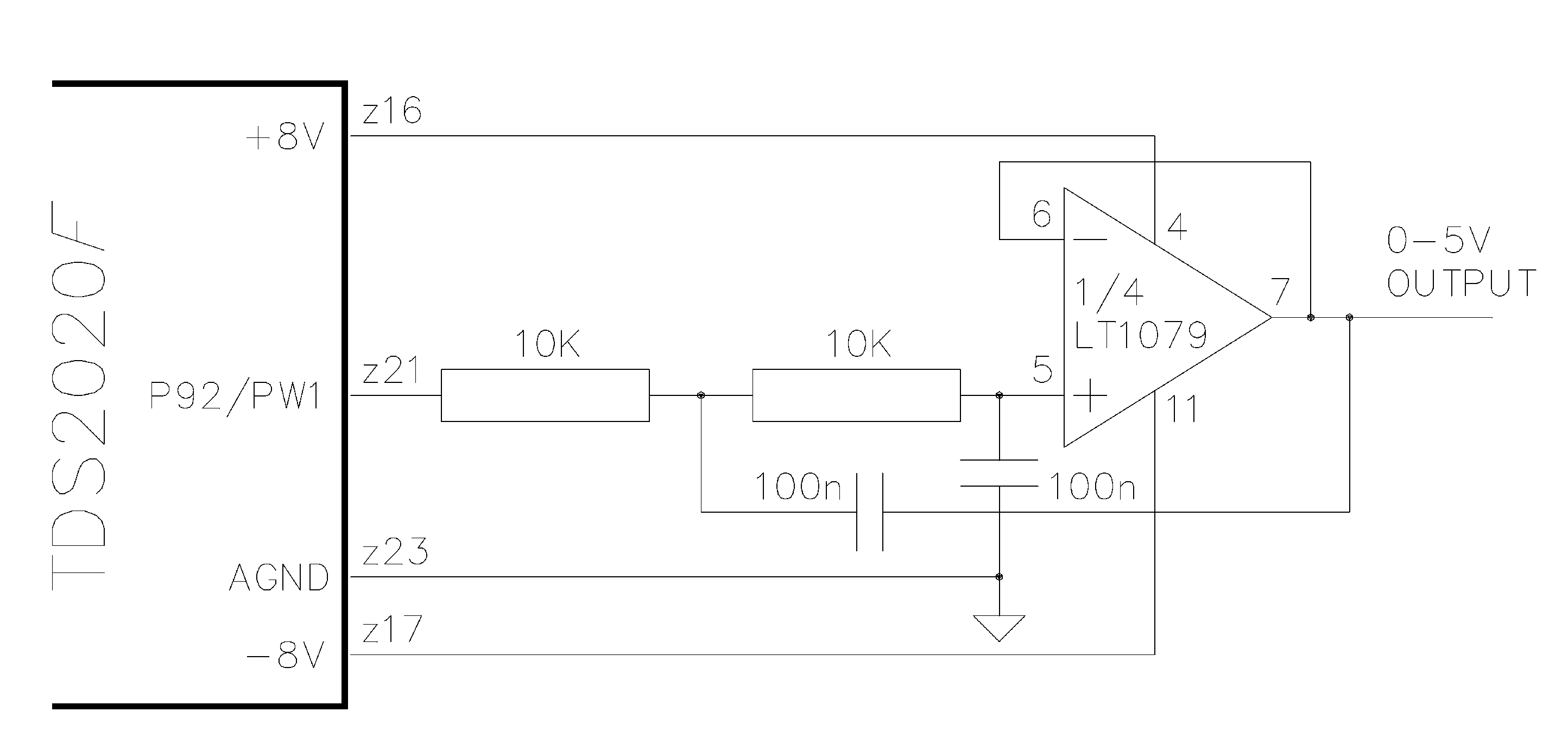 D to A output buffer & filter suggestion The filter can be as simple as an RC network (10k and 1�0 recommended) or the filtering may form part of subsequent signal conditioning (the output impedance of the pins is typically 140 ohms). The circuit shows a typical second order filter that gives a response time of about 2ms to step inputs. The word D-A takes a channel number 0 to 2 to be in line with Forth (where all counts start from 0) but for consistency with Hitachi documentation the pin names are PW1 to PW3. In the example the PWM output will appear on pin PW3 since channel 2 was selected. By accessing internal registers of the PWM system the frequency can be changed to any of the following, see the Hardware Manual Section 12 for details: